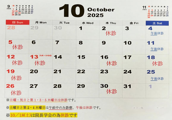 10月は2日・16日・30日が休診となります。(9日・23日が午前診療です)